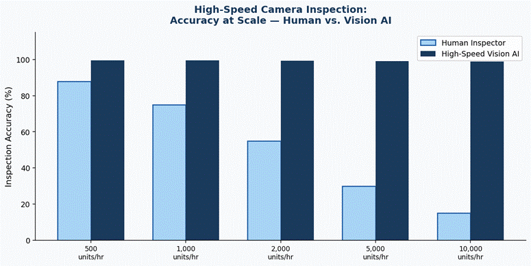 Figure 2: Detection rate comparison at high production speeds - Vision AI vs. human inspection. At 5,000+ units per hour, the gap is categorical.