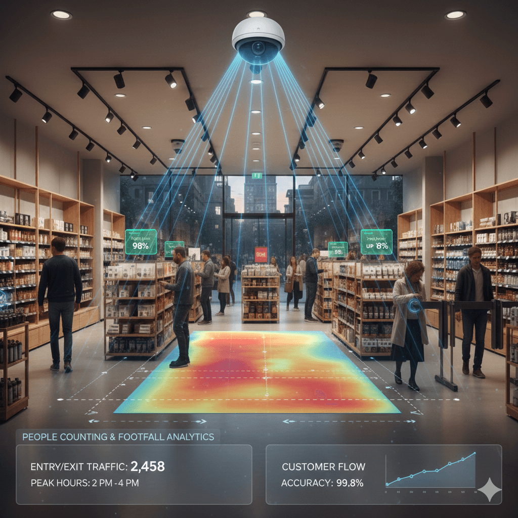 Measure entry/exit traffic, peak hours, and customer flow accurately.